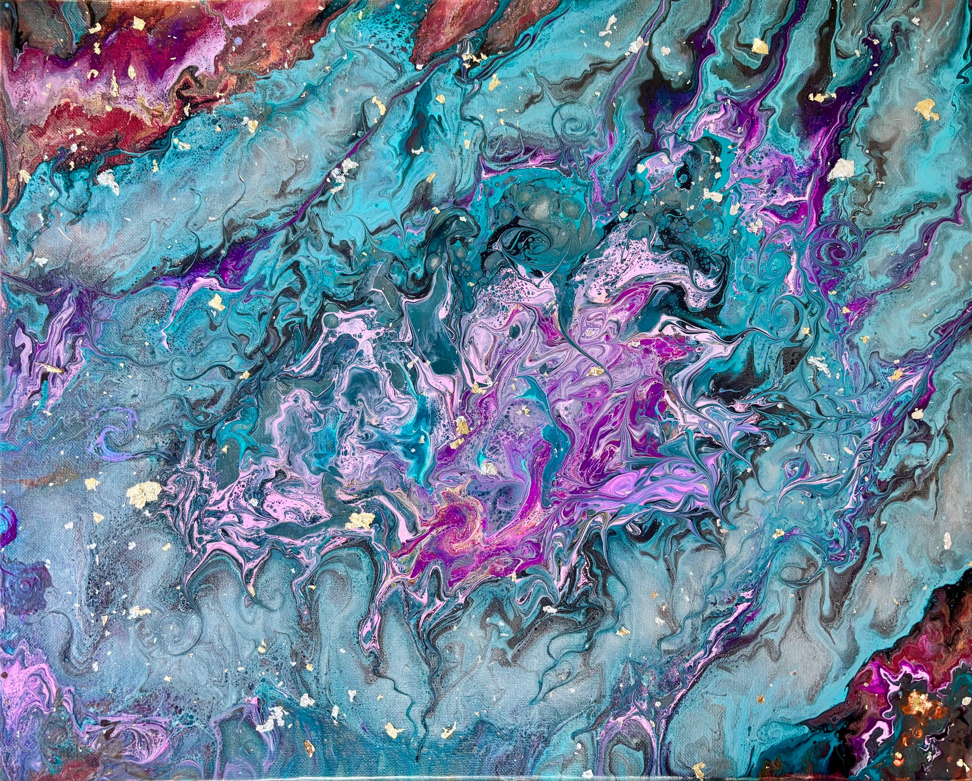 This 16" x 20" acrylic painting features fluid techniques that bring dynamic movement and rich texture to the composition. Presented as a gallery wrap, the artwork extends seamlessly around the edges for a contemporary, ready-to-hang display. Its expert use of fluid acrylics captures intricate details and vibrant color flow, making it a striking addition to any collection.